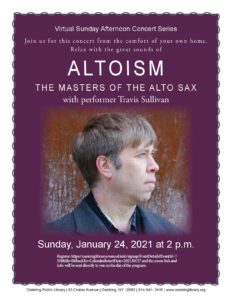 Looking forward to my first concert of 2021.  I have some fun ideas in the works for this first-ever virtual presentation of my program “Altoism: The Masters of the Alto Sax.” I will be performing the music of the alto saxophonists ranging from Benny Carter to Ornette Coleman, on both saxophone and piano.